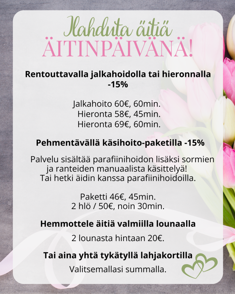 Rentouttava jalkahoito tai hieronta, pehmentävä käsihoito-paketti tai parafiinihoito äidin kanssa, maukas lounas tai lahjakortti jolla äiti voi valita itselleen mieluisan lahjan.