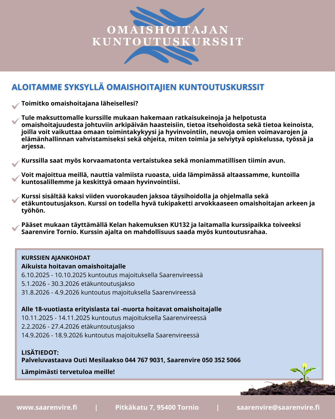 Toimita Hakemuslomake KU 132 Kelaan ja laita paikkatoiveeksi Saarenvire Torniossa. Et tarvitse lääkärinlausuntoa tai muitakaan liitteitä. Kuntoutusta omaishoitajille tarjoamme useammalla kurssilla vuosittain. Jokaiselle kurssille mahtuu kymmenen kuntoutujaa.